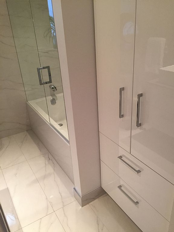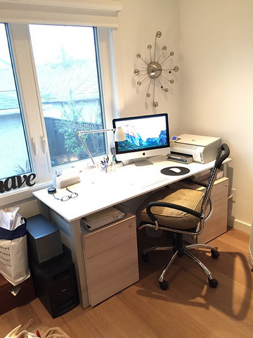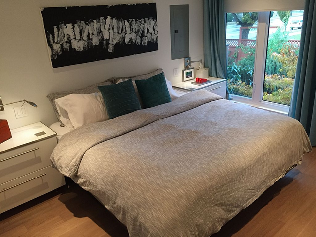 Master bedroom features custom built in cabinetry with comfortable King size bed. Second bedroom doubles as home office and is equipped with a Double wall bed with lots of storage.