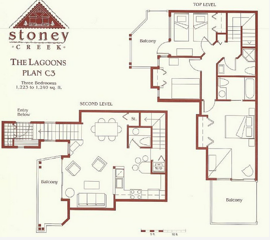 This 1,200SF unit spread over 2 floors has 3 Bedrooms, 2.5 Baths, and 3 balconies. The bedroom breakdown is as follows: