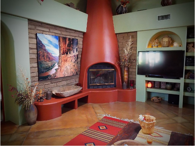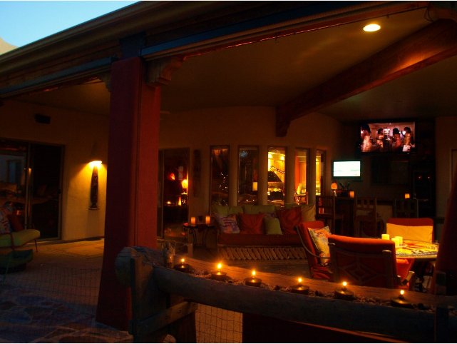 (Large Casita) The larger Casita is 2-bed/1 bath (1800 sq. ft.), which sleeps 4-6.. It has a large gourmet kitchen and large bedrooms, indoor fireplace, and large TV’s throughout. Outside is a 100 ft wrap around patio with couches, dining table, outdoor fireplace, propane heaters, and incredible sunset views.