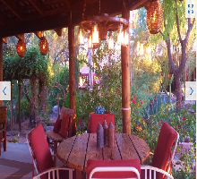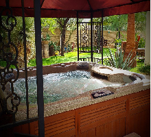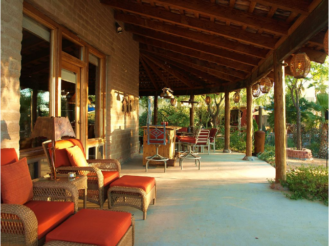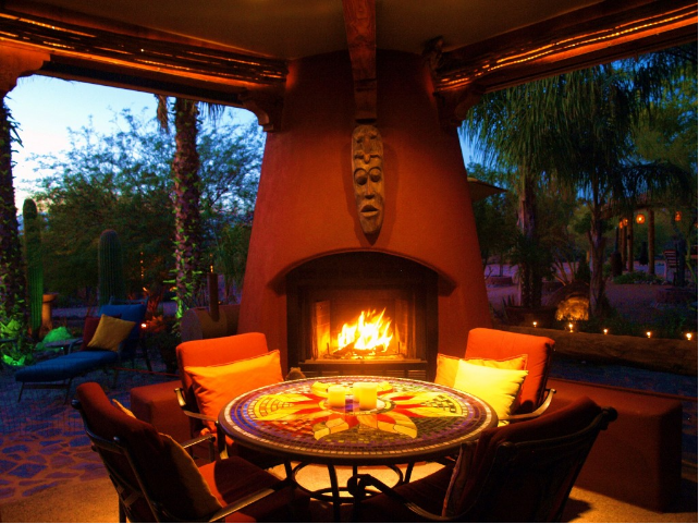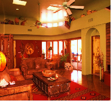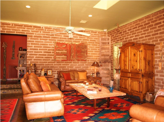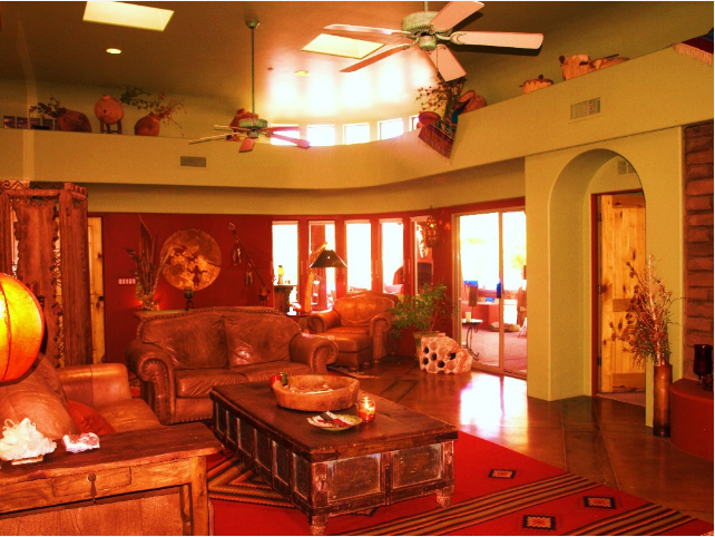 (Main House) This unique custom built feng shui 5 br/3 bath (sleeps 10) home has 15 ft. ceilings, adobe brick walls, indoor fireplace, authentic Mexican furnishings, stained concrete floors, surround sound inside and out, TV’s throughout and much more. Outside there is a large covered patio with two satellite TVs, Linx BBQ grill, bar, fireplace, 2 propane heaters, fire pit, and even a large rock fountain. The views are incredible, and the white lights in the lush landscaping make it look like your own private resort. It also has an eight-person hot tub for you to relax in, and the views from the tub are stunning.