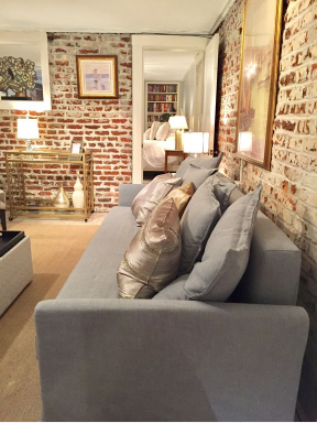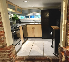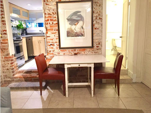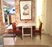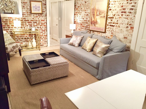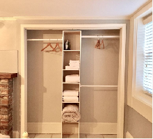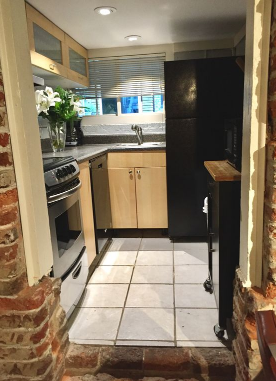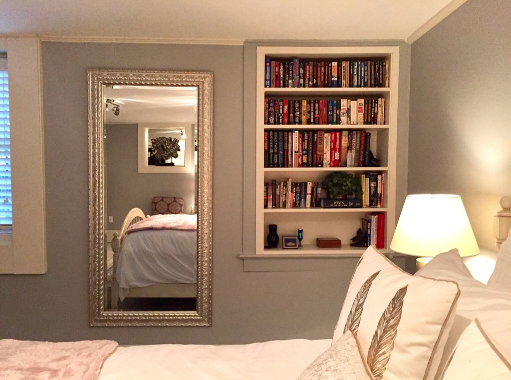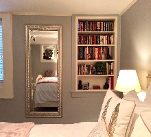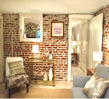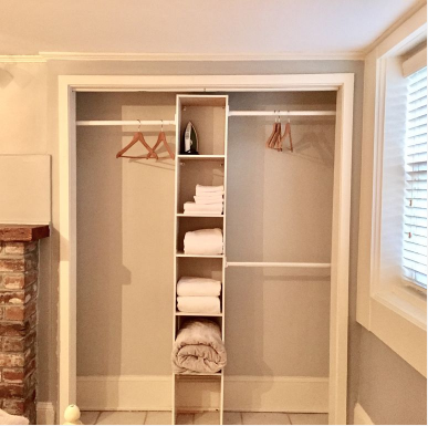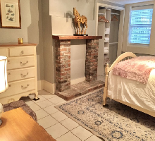 Bright and airy meets cozy in this exposed brick apartment which was once the original kitchen. The bedroom features a queen bed, a spacious closet, a larger dresser, and a built in bookshelf with lots of books.