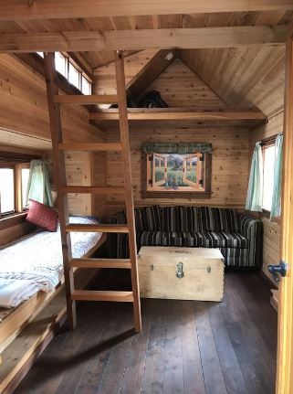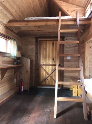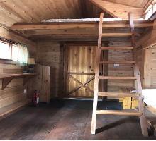 Entirely made of cedar, the cabin is heated and insulated with a 14 ceiling. There is a small fridge and a coffee pot. Guests need to come inside to use the washroom.