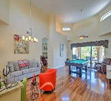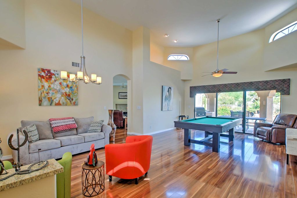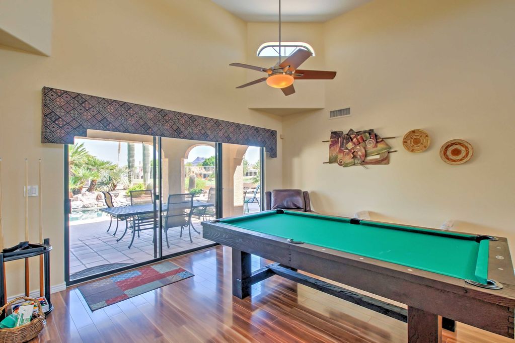 Relax on the couch in the main entry room as your companions challenge each other to a game of pool. For some fresh air, open the sliding glass doors and enjoy the breeze that flows in off the backyard.