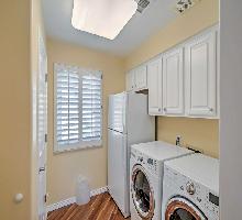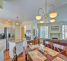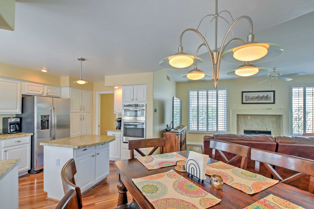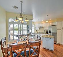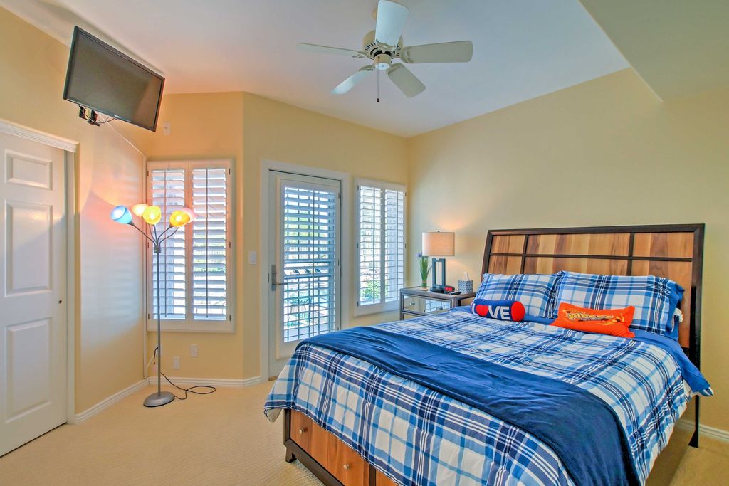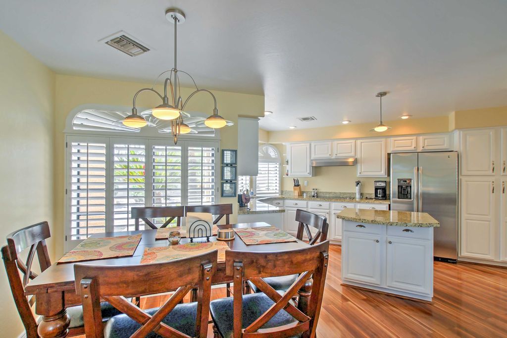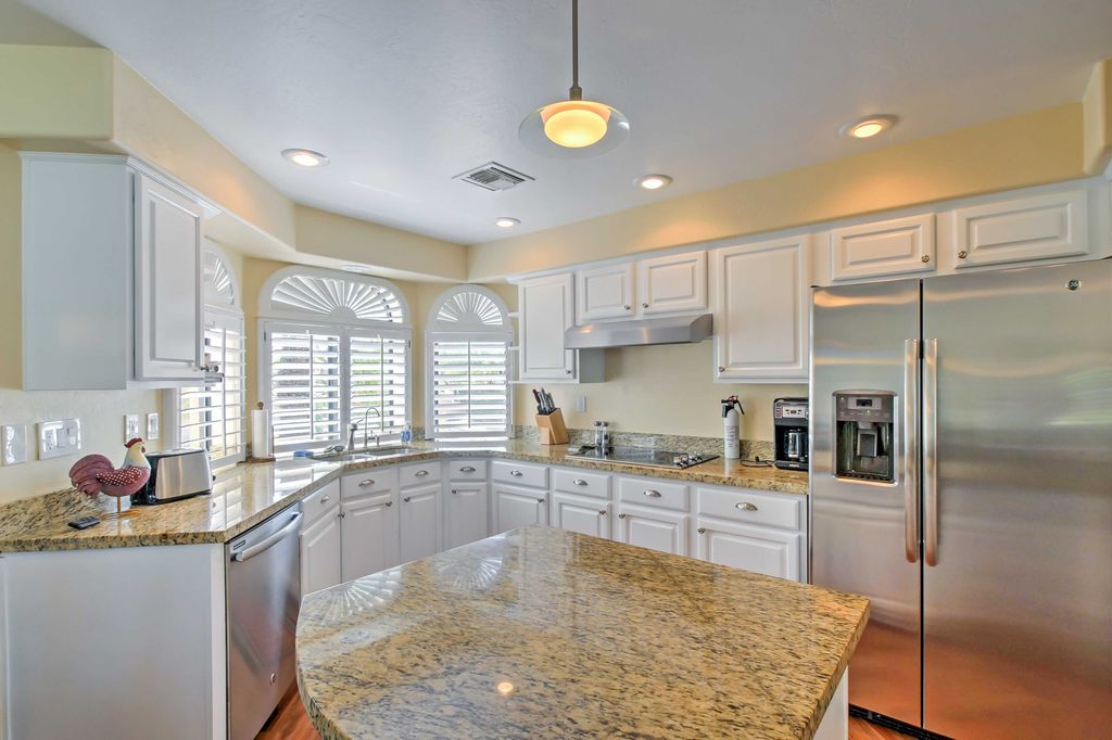 White cabinets, granite countertops, and stainless steel appliances embellish the fully equipped kitchen, which has everything you’ll need to prepare your favorite home-cooked meals. Gather around the wood dining table set for 6 or head outside to the covered patio, and enjoy dinner outdoors.