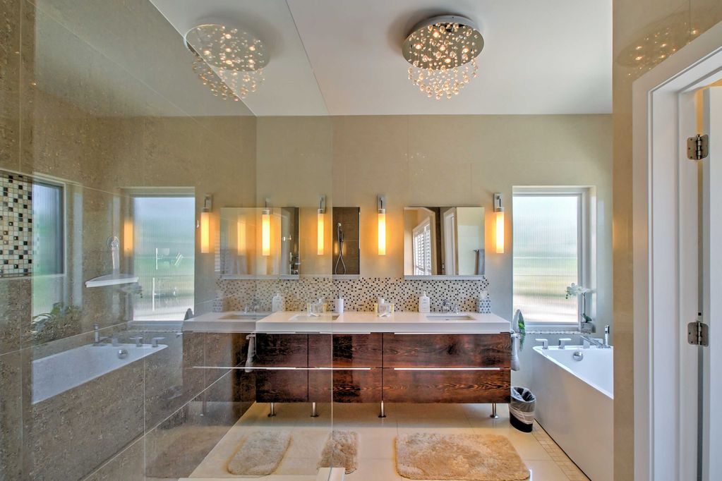 When you’re ready to retire for the evening, head to the the master bedroom, which boasts a king-sized bed, flat-screen cable TV, and an en suite bathroom. The sleek, modern bathroom offers dual sinks, a walk-in shower, and a bathtub. Both the second and third bedrooms feature queen-sized beds and flat-screen cable TVs.
