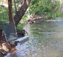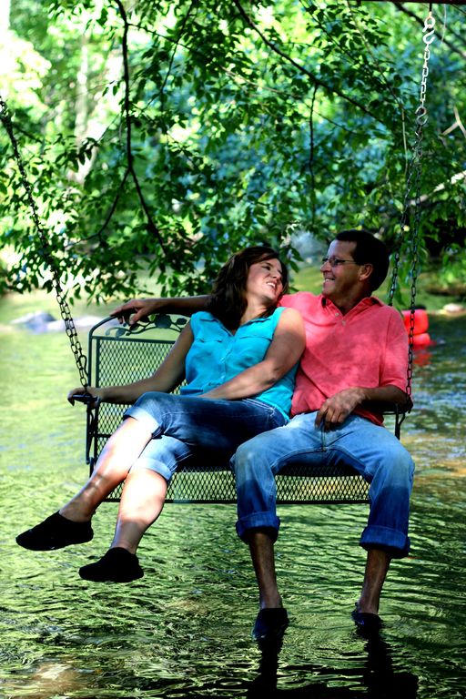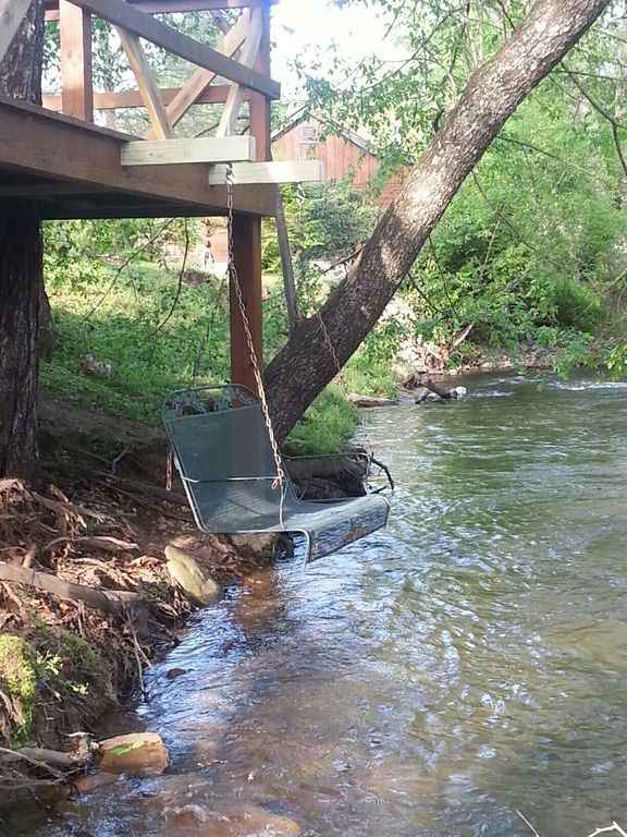 This cabin rental features a CREEK SWING that has become our guests favorite amenity! Its the perfectly unique spot to dangle toes into the rushing water while enjoying nature sights and sounds or just reading a great book.