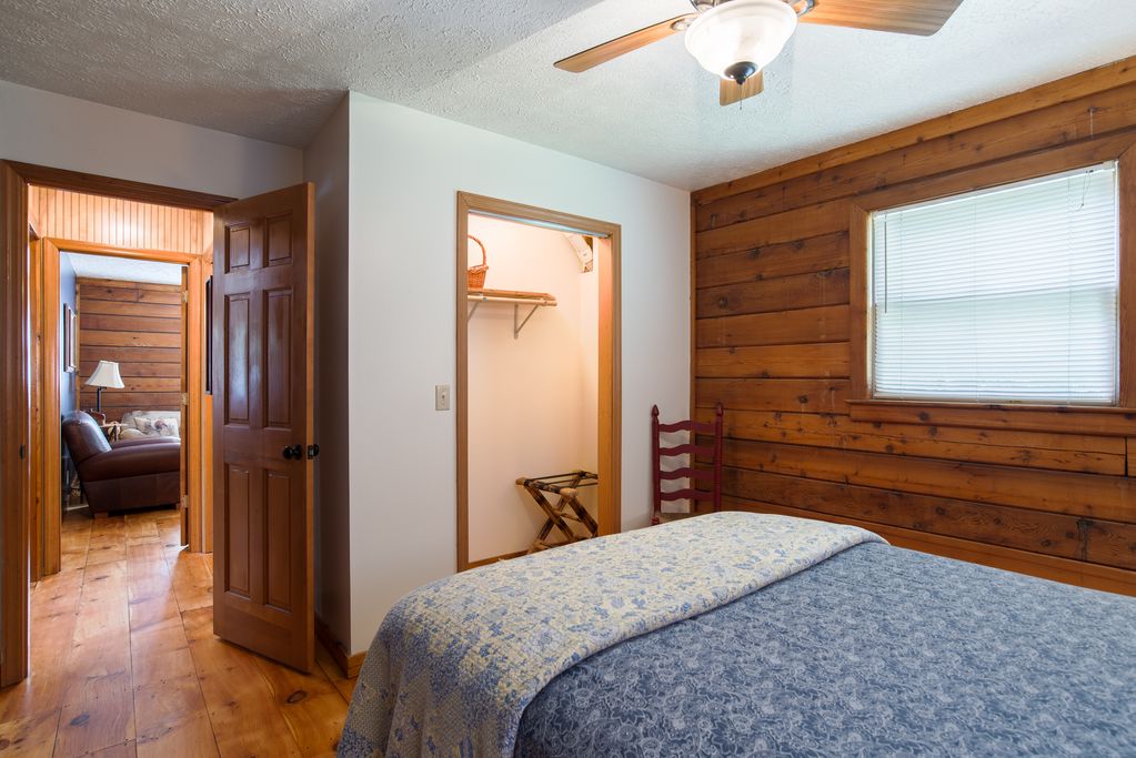 This cabin rental SLEEPS UP TO 8: 1 KING bed (in 2nd floor bedroom with closet, ceiling fan, reading lamps, chest of drawers, mirror, comfy chair, window facing creek), 1 QUEEN (in main floor bedroom with closet, ceiling fan, mirror, reading lamps, chest of drawers, window facing creek ), and 2 FUTONS (1 in open loft with ceiling fan & window facing creek, 1 in den with closet, ceiling fan, window & door to creek). Bedding provided.