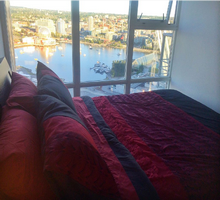 Boasting luxurious details such as floor-to-ceiling windows, high-end design features, and modern European furnishings, guests are treated to an unparalleled experience in the heart of the city. This suite is fully furnished with a 52 plasma television, queen beds with memory foam mattresses, leather seating throughout, a bar table, a work station, iPod docks, and a washer / dryer unit.